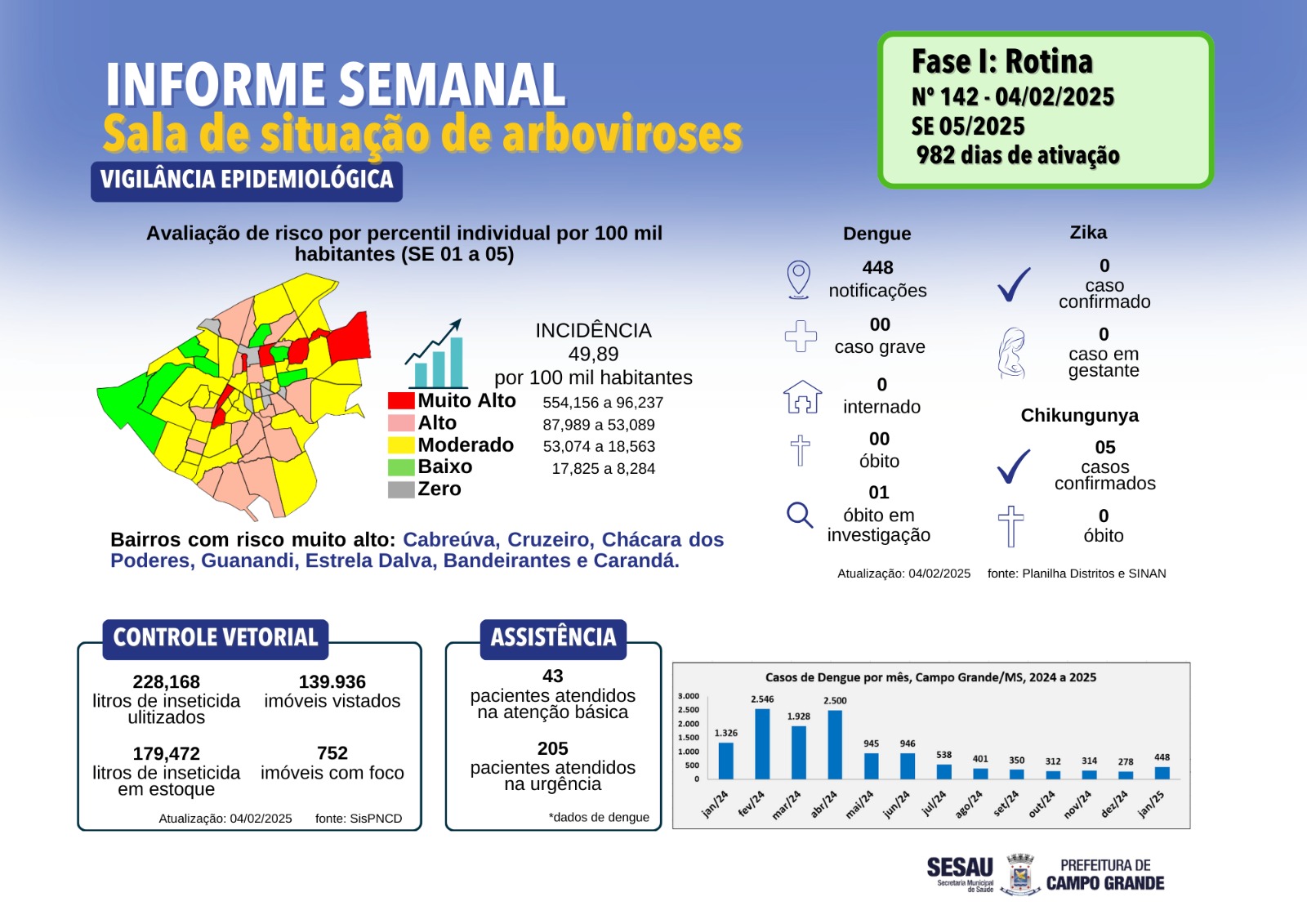 · Fumacê e bloqueios químicos: O serviço de pulverização tem sido realizado com frequência em diversos bairros de Campo Grande, utilizando máquinas para combater a infestação, com monitoramento constante das áreas de maior risco.