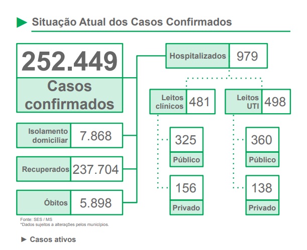 Com média móvel de 874,7 nos últimos sete dias, os cinco municípios que apresentaram maior incidência de novos positivos nas últimas 24 horas são os seguintes: Campo Grande + 285; Dourados +121; Três Lagoas + 113; Naviraí + 48 e Ponta Porã +44 novos casos.