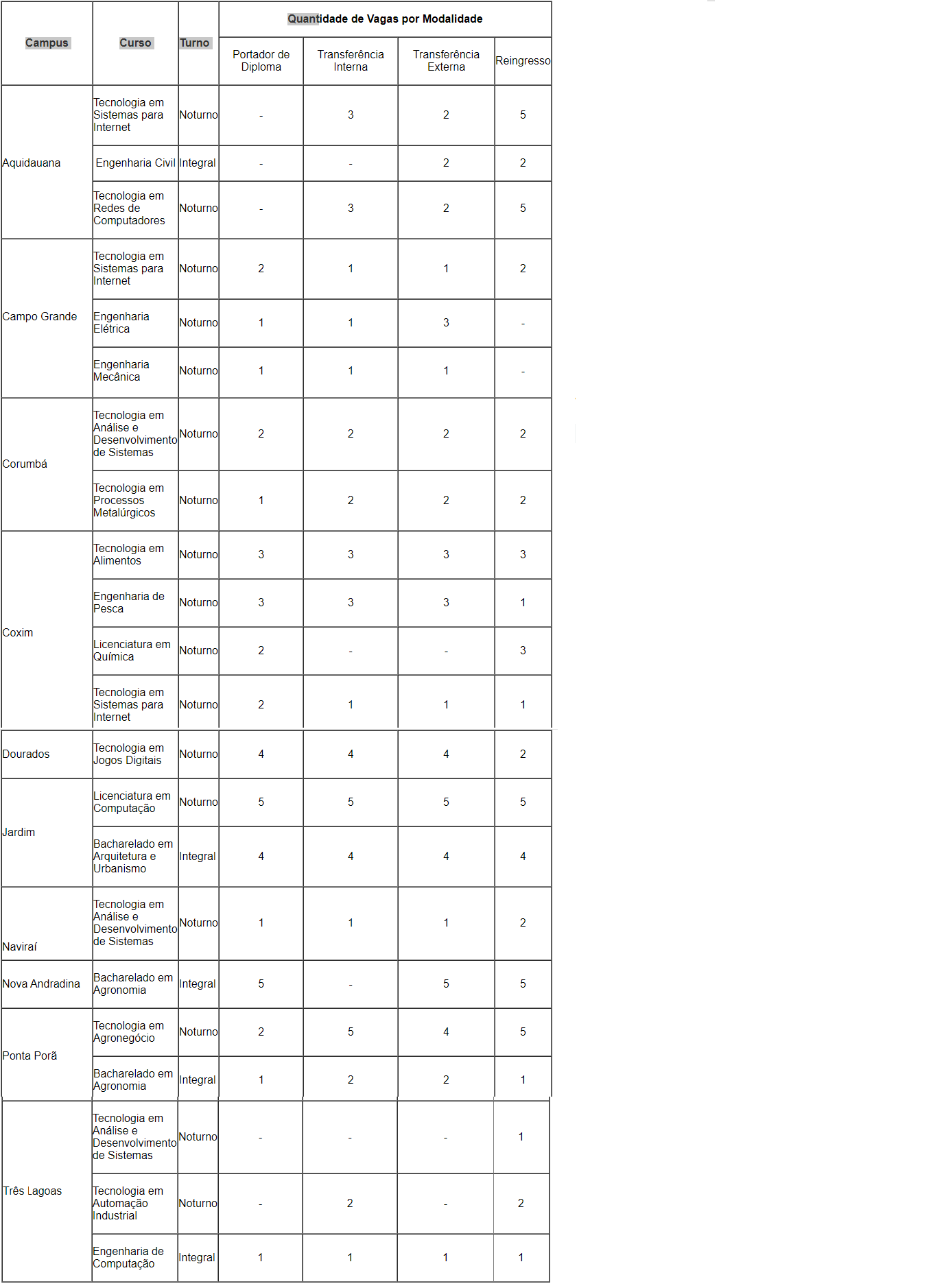 Ao todo, são ofertadas 191 vagas, com opções em cursos superiores de tecnologia, bacharelados e licenciaturas, em Aquidauana, Campo Grande, Corumbá, Coxim, Dourados, Jardim, Naviraí, Nova Andradina, Ponta Porã e Três Lagoas.