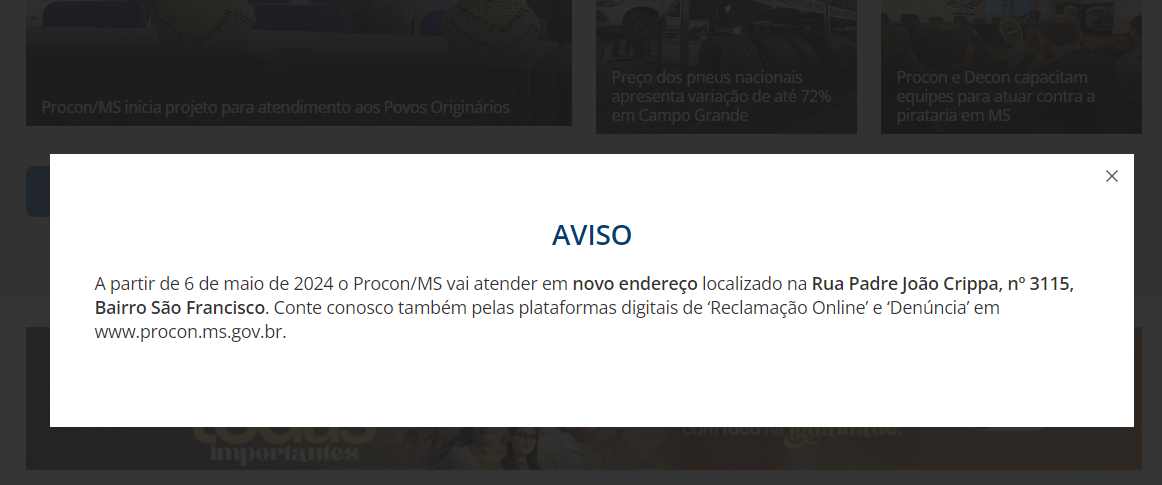 A partir desta segunda-feira (6), o Procon Estadual, em Campo Grande, passa a atender a população em novo endereço. O aviso da alteração de endereço, saindo da Rua 13 de Junho para Rua Padre João Crippa, 3115, Bairro São Francisco, está em exposição no site do órgão.
